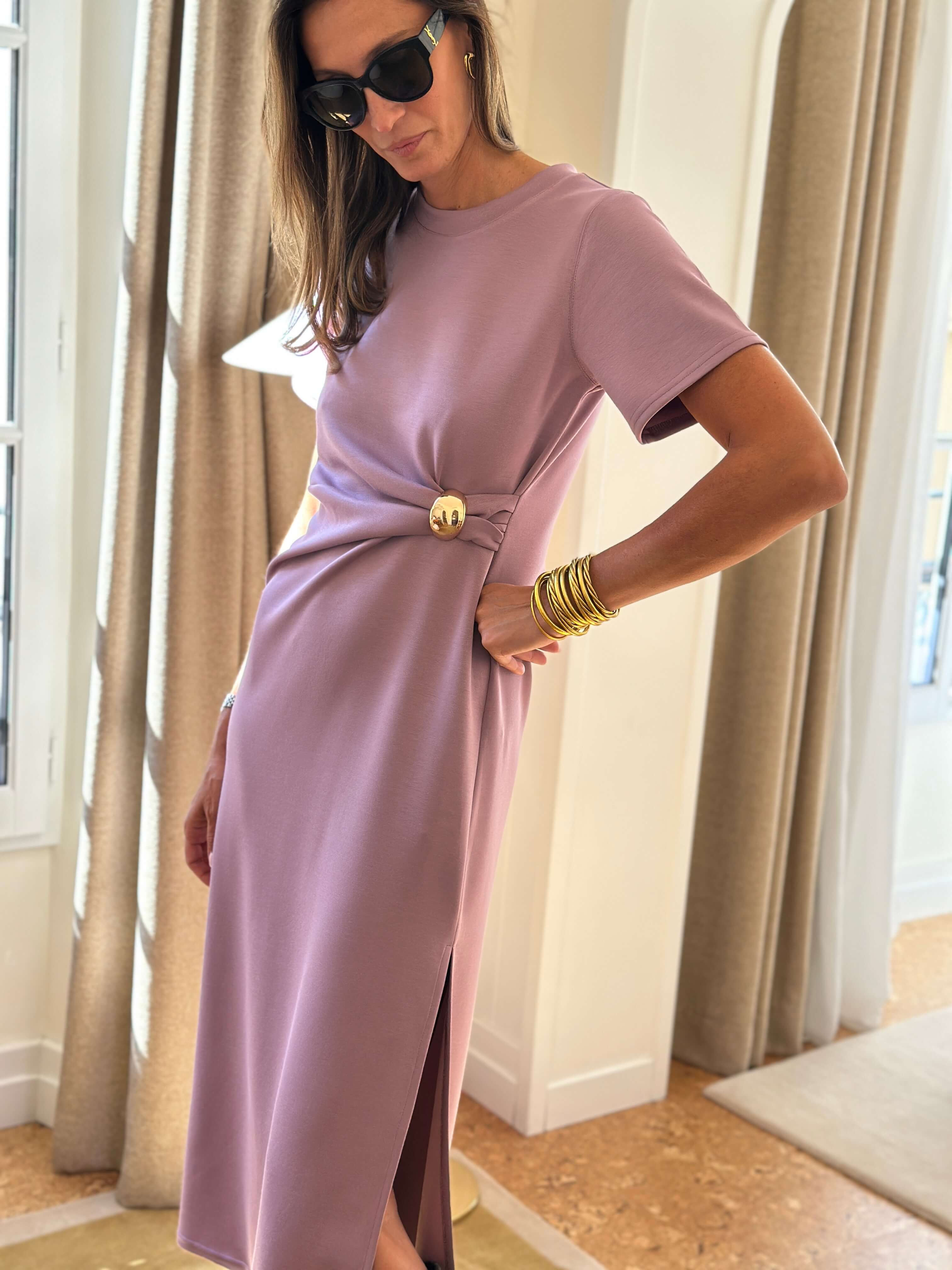 We love his ultra-flattering straight cut, her detail of gold buckle which subtly cinches the waist, and its fluid and stretchy material which fits perfectly on the body without clinging.