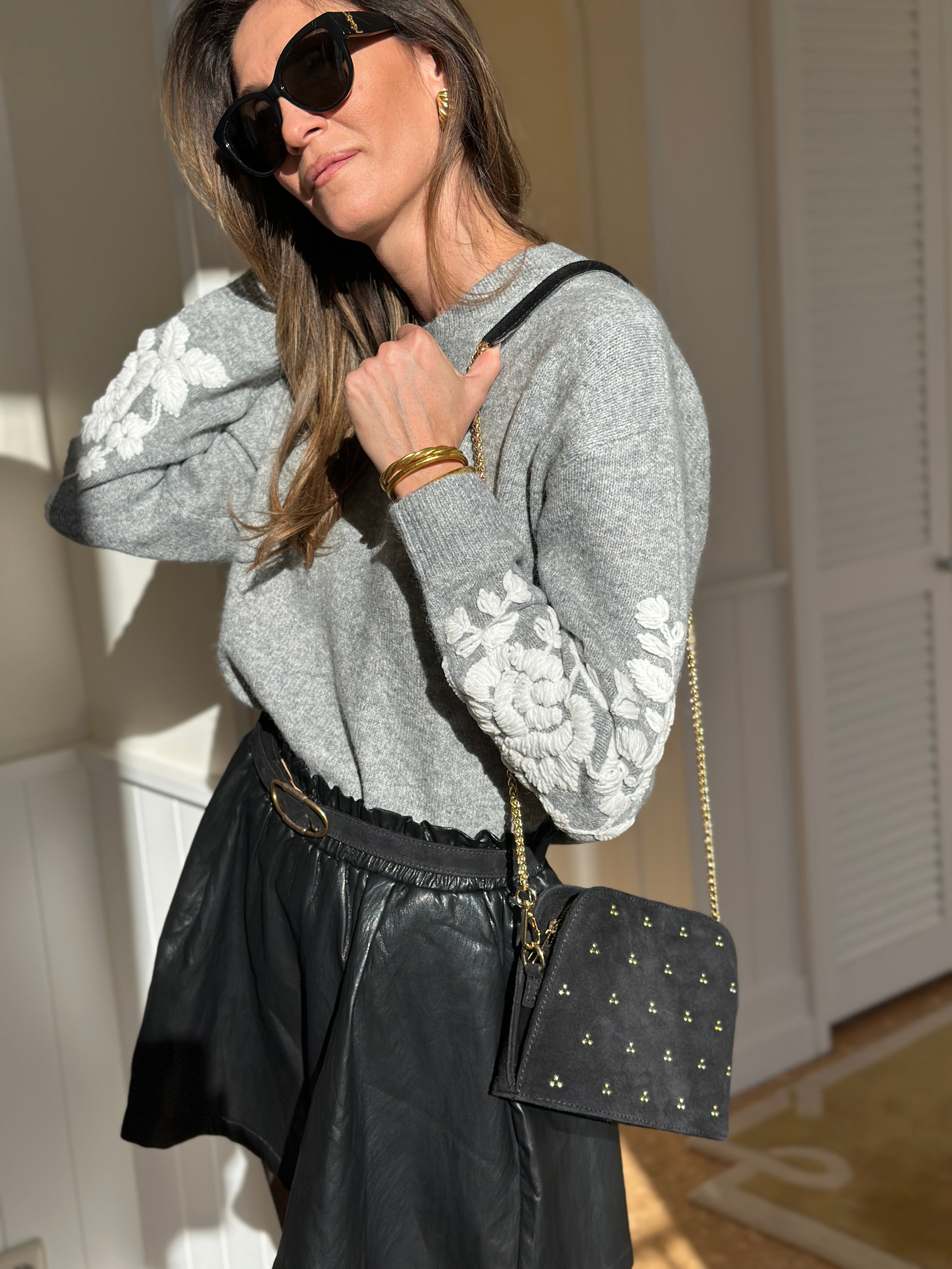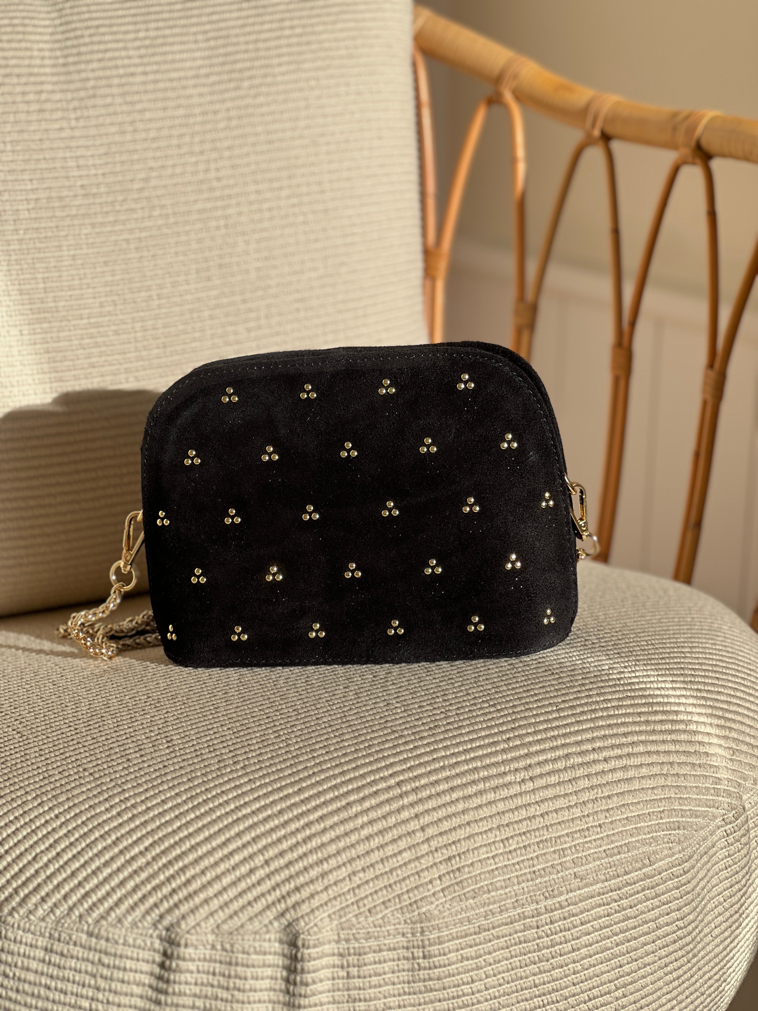 This leather bag is distinguished by its small raised gold nails, perfectly distributed for a chic and luminous touch. It combines practicality and refinement with its gold chain which allows it to be worn over the shoulder or across the body, depending on your preference.