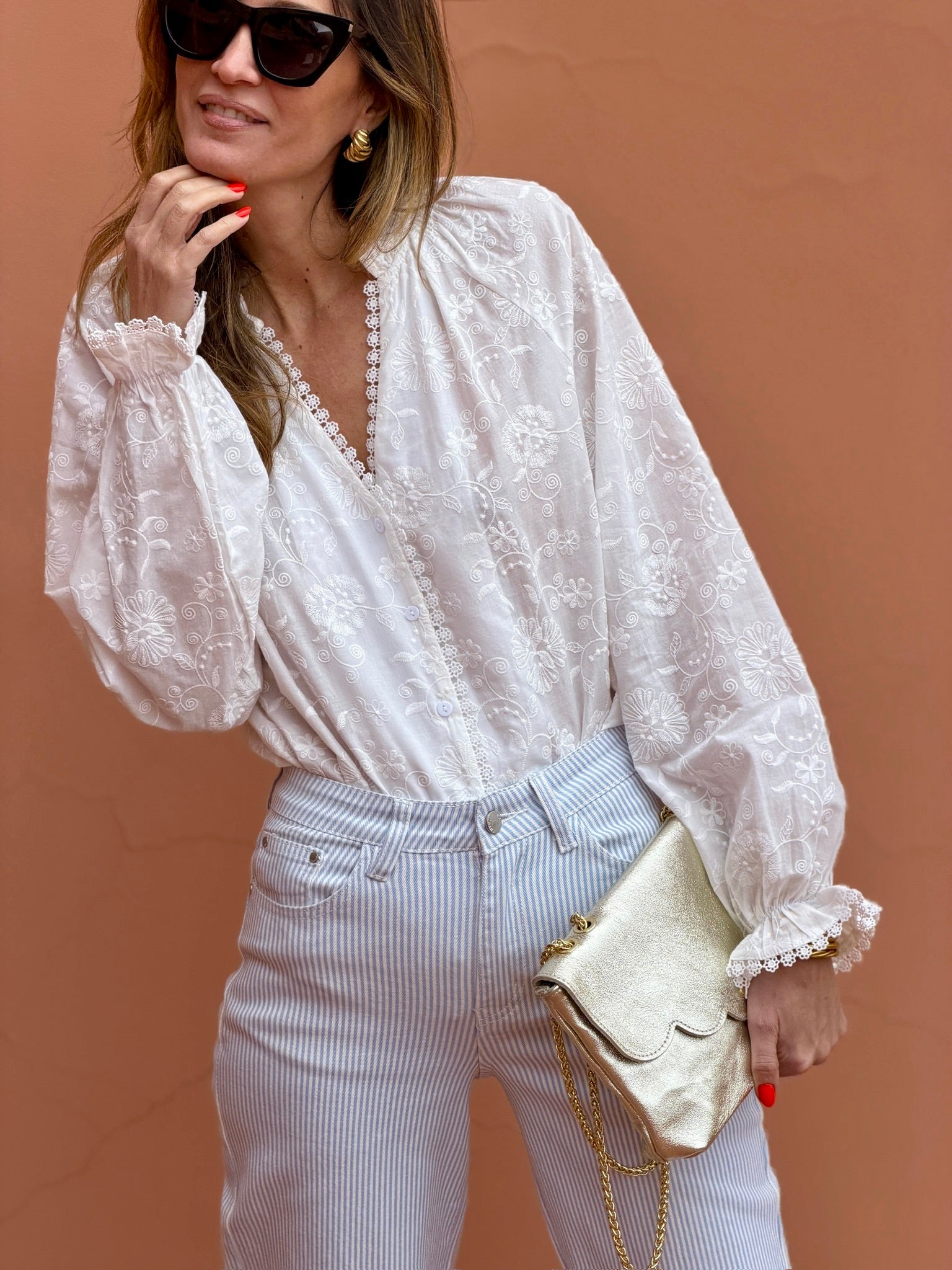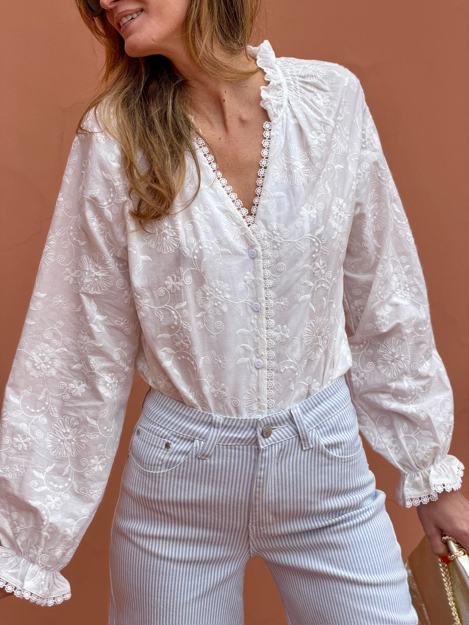 And we love its scalloped neckline finish, as well as its openwork finish along the button placket.