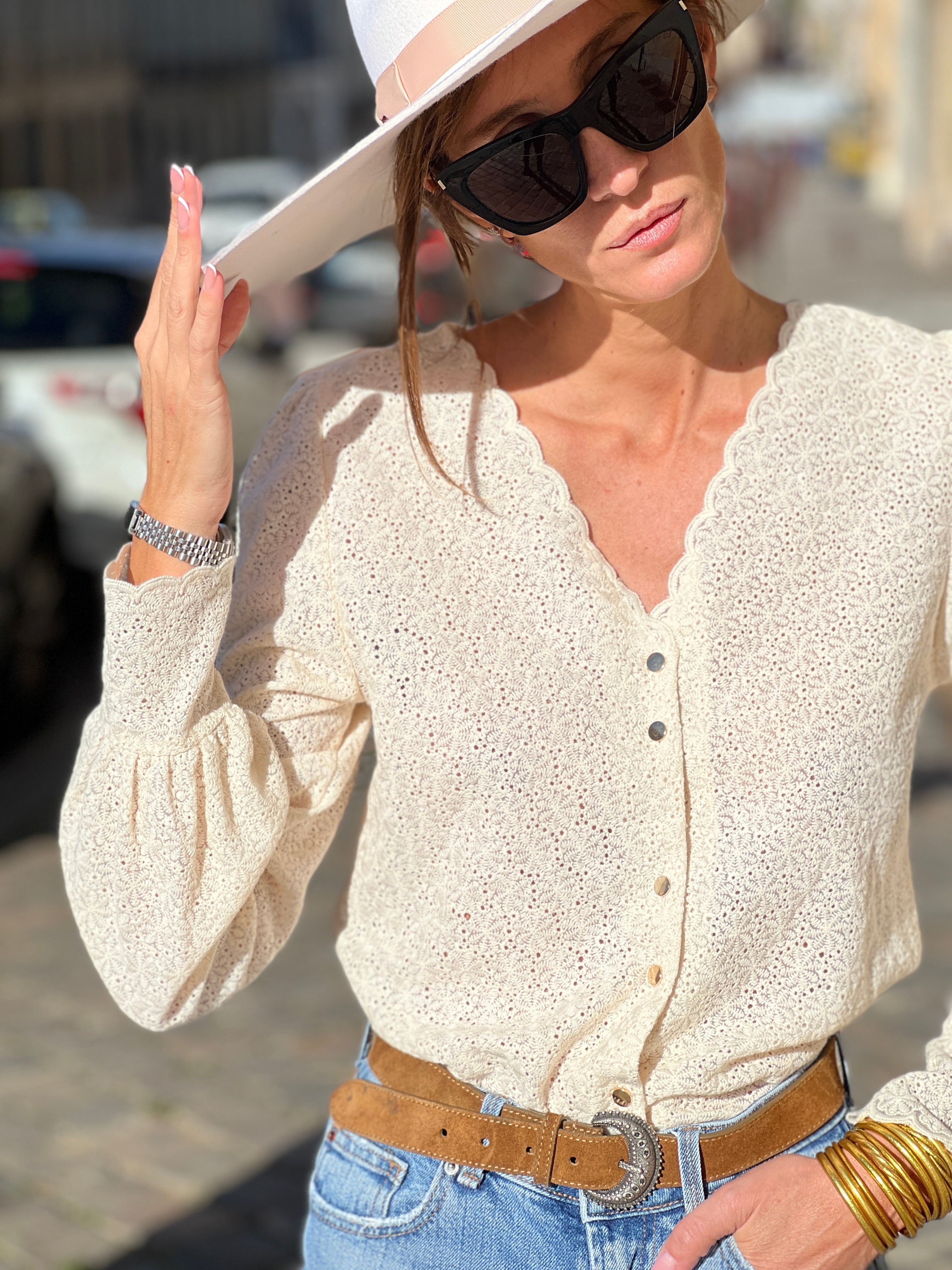 The belt and jeans worn by Lucie are personal items and are not offered for sale by the brand.