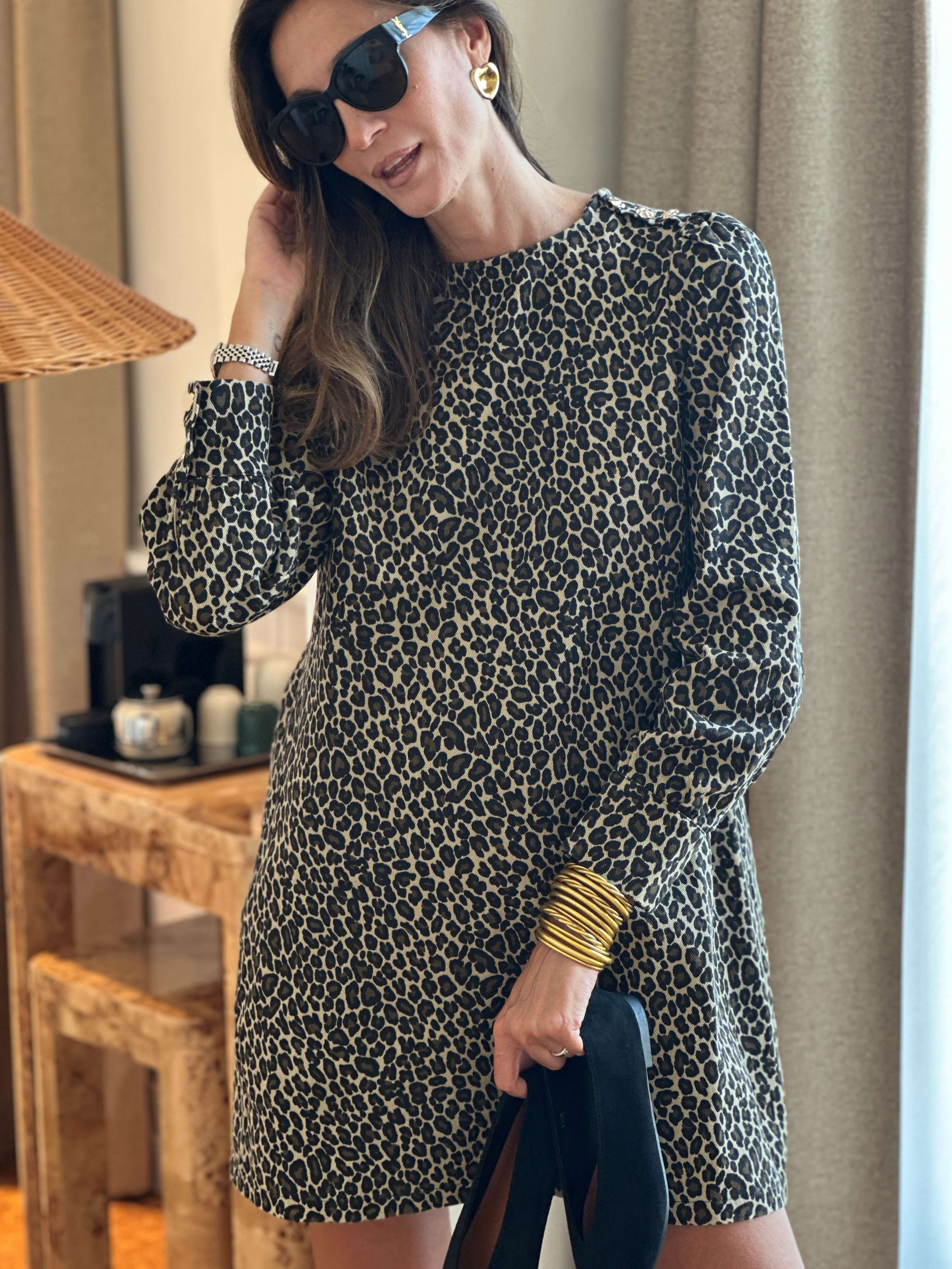 Iconic short dress in leopard washed denim, long sleeves and chic look