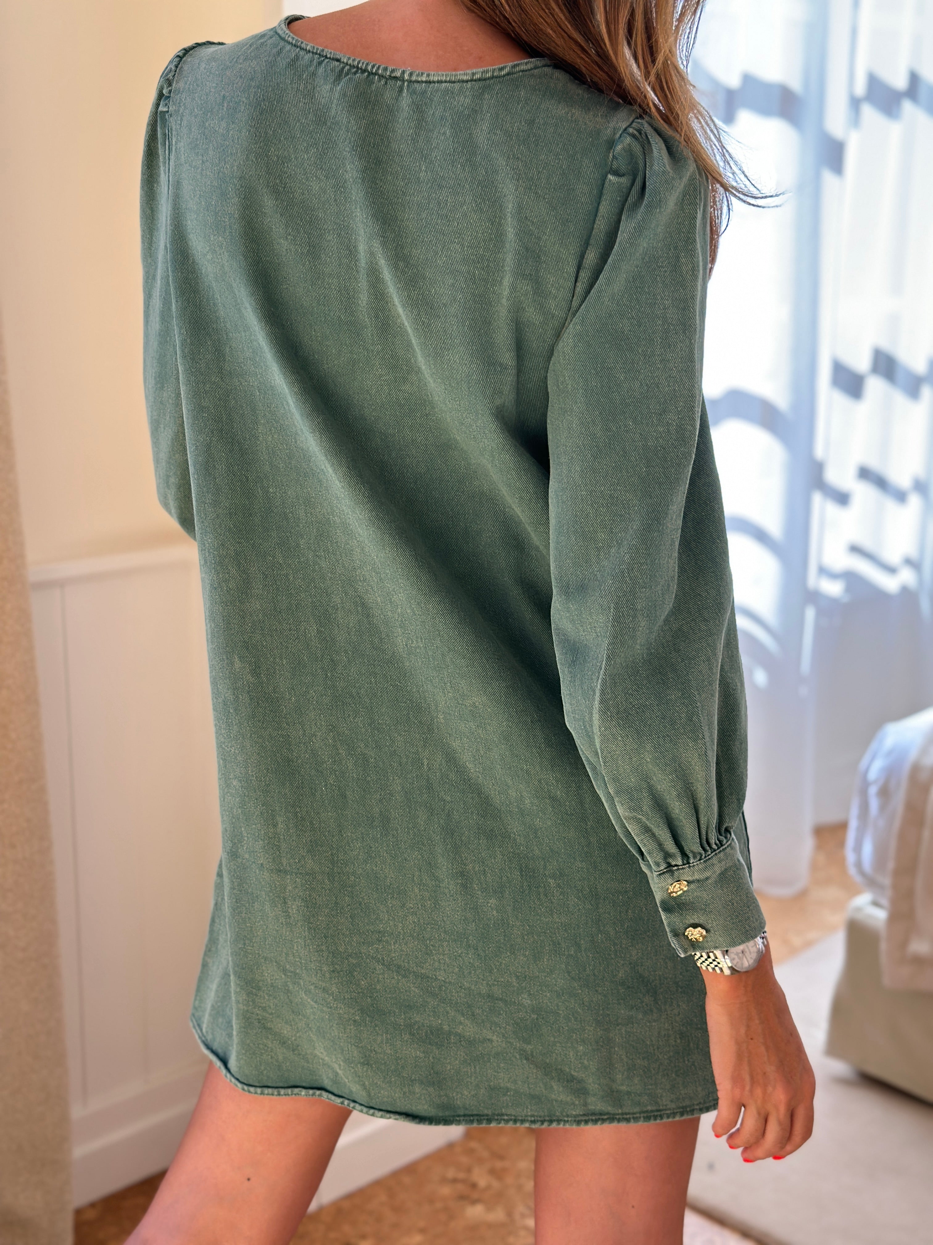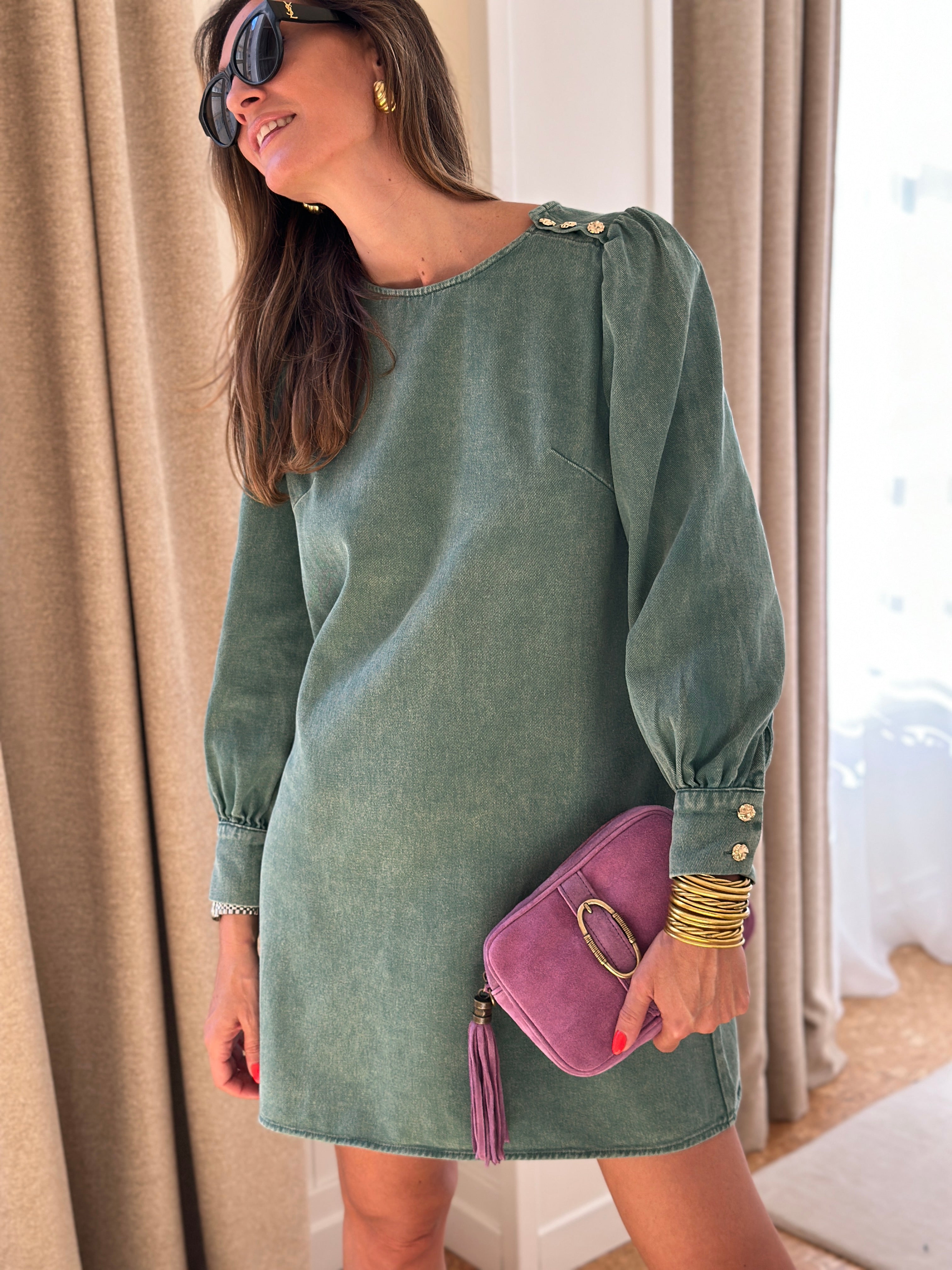 OUR short denim dress returns as it does every month in a New color, limited quantity for a look both trendy and daring.