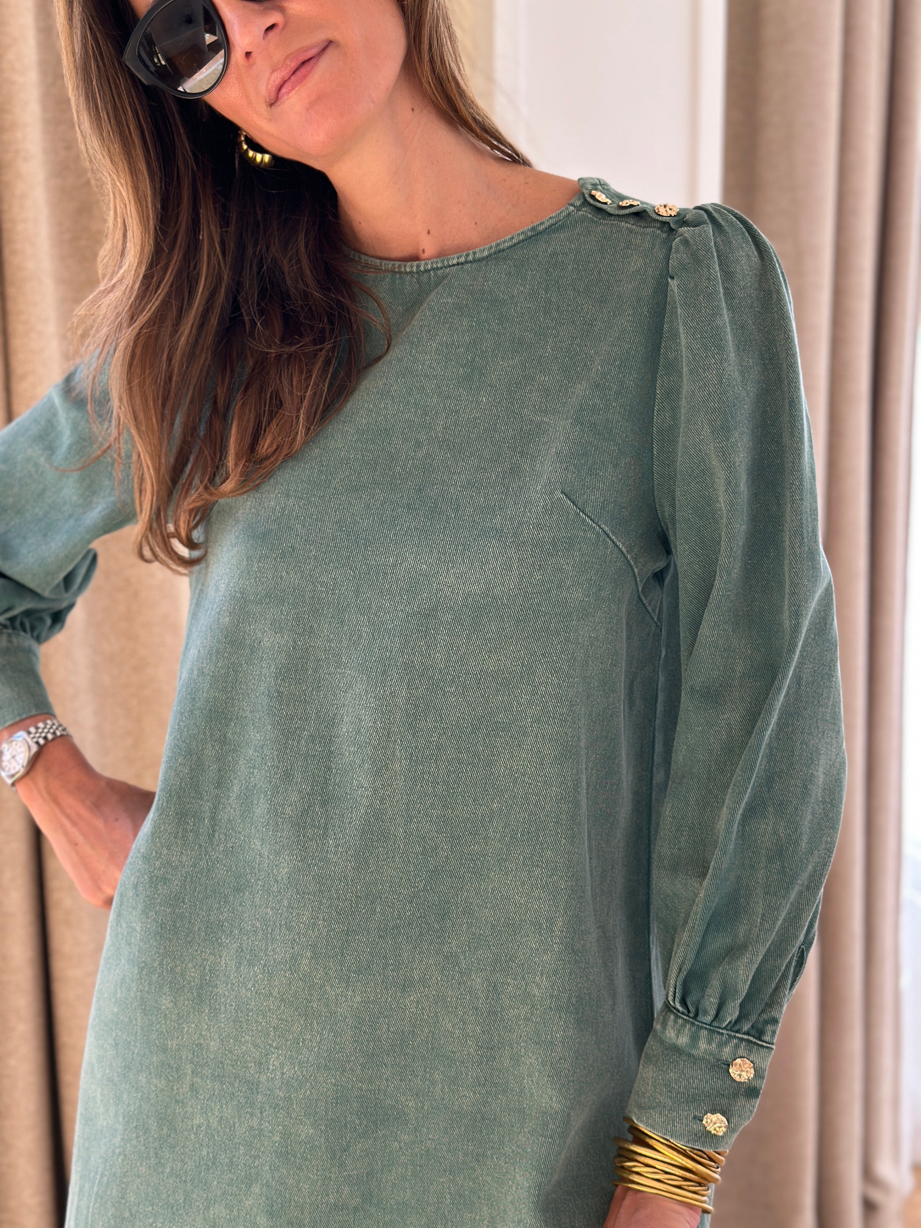 Iconic short dress in washed denim, long sleeves and chic look