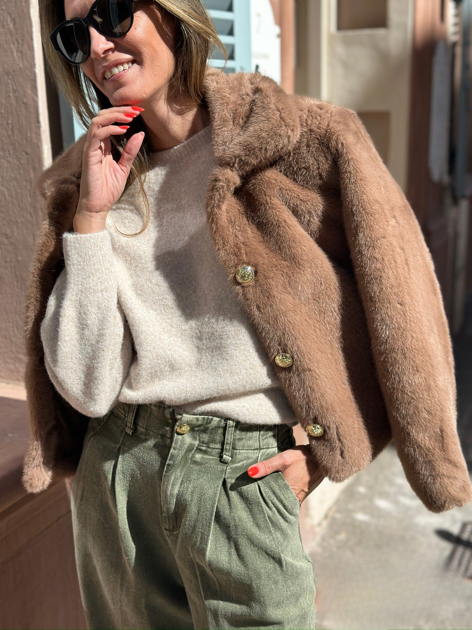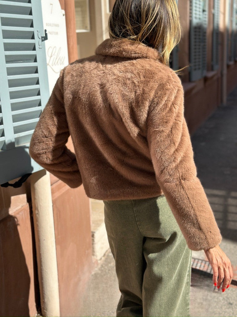 This faux fur jacket with its updated vintage style is a little gem for autumn/winter. With its short, structured cut, couture-inspired gold buttons, and ultra-feminine wide collar, the Angelina jacket becomes a chic essential in your winter wardrobe. ♡