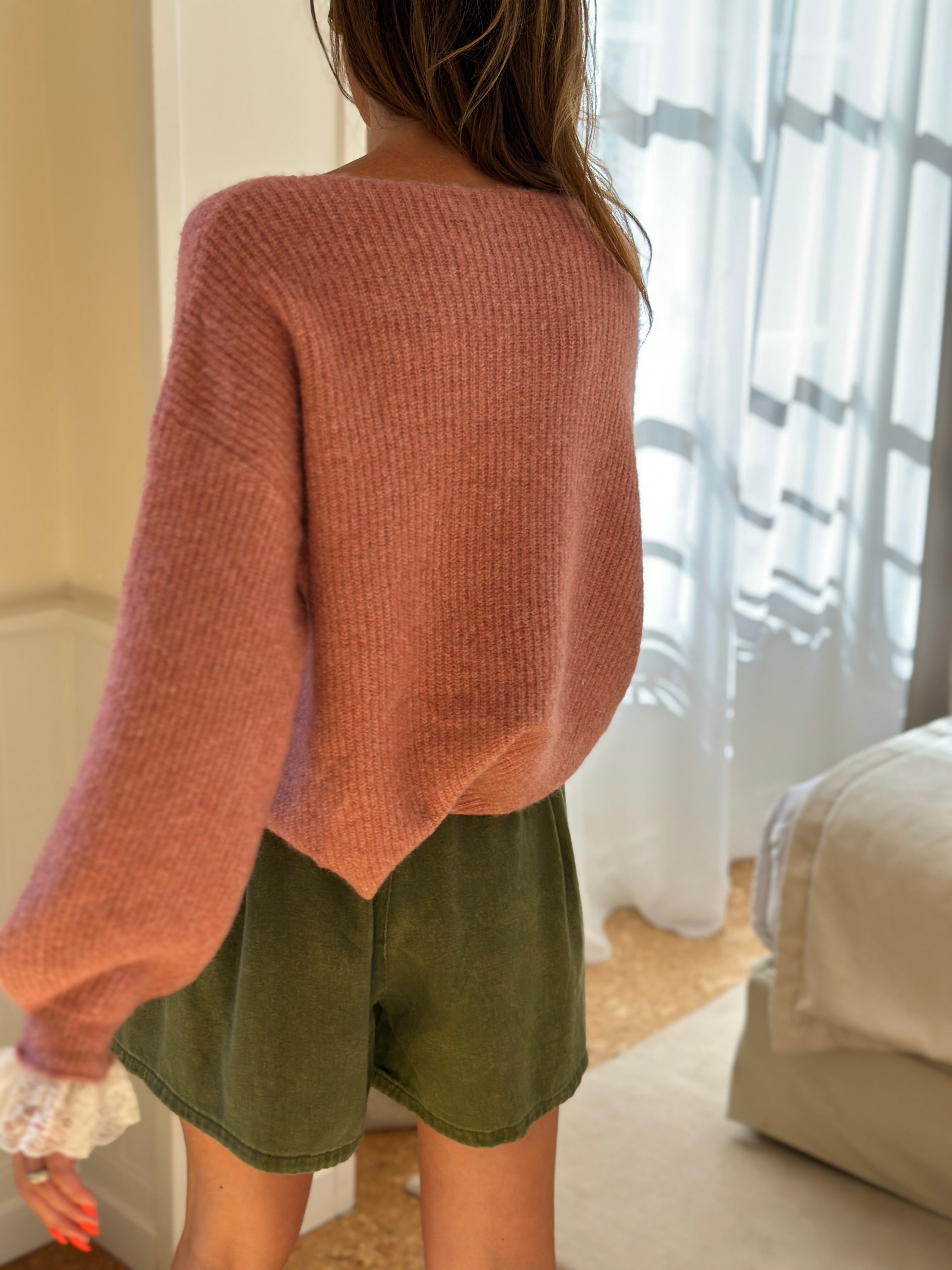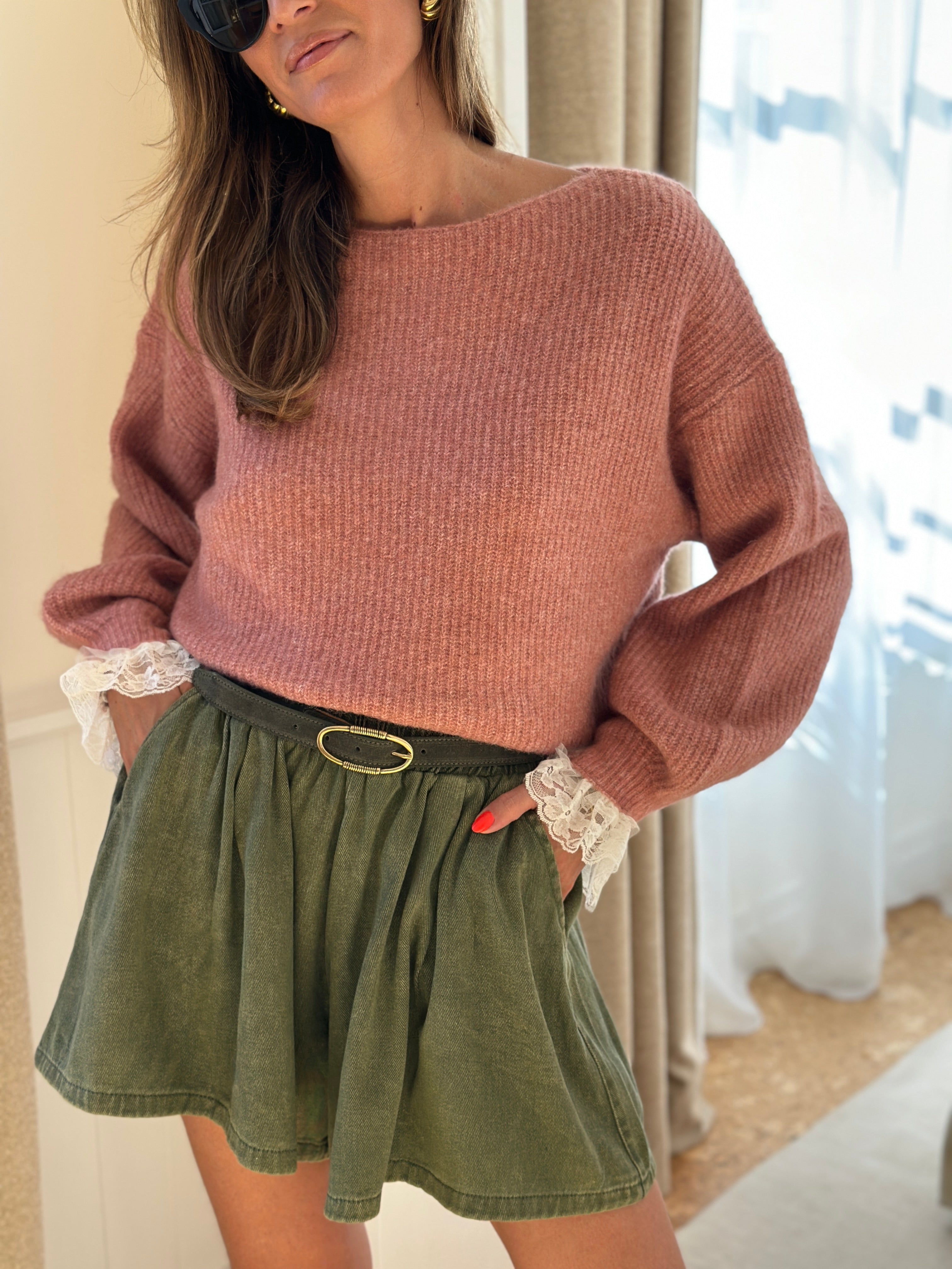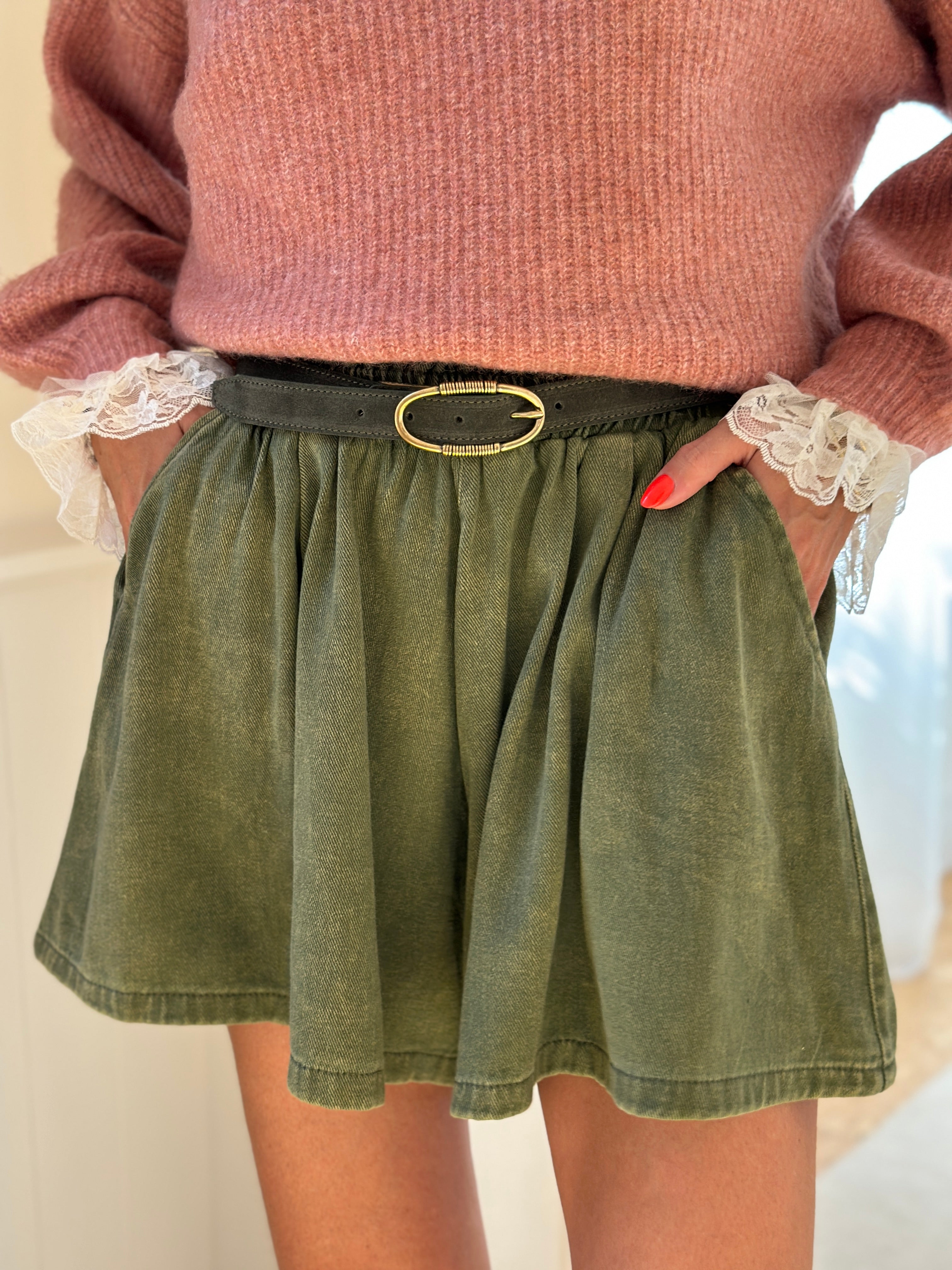 The shorts Amalia in slightly faded khaki denim, appealing because of its flattering and feminine lineperfect for mid-season as well as for Indian summer.
