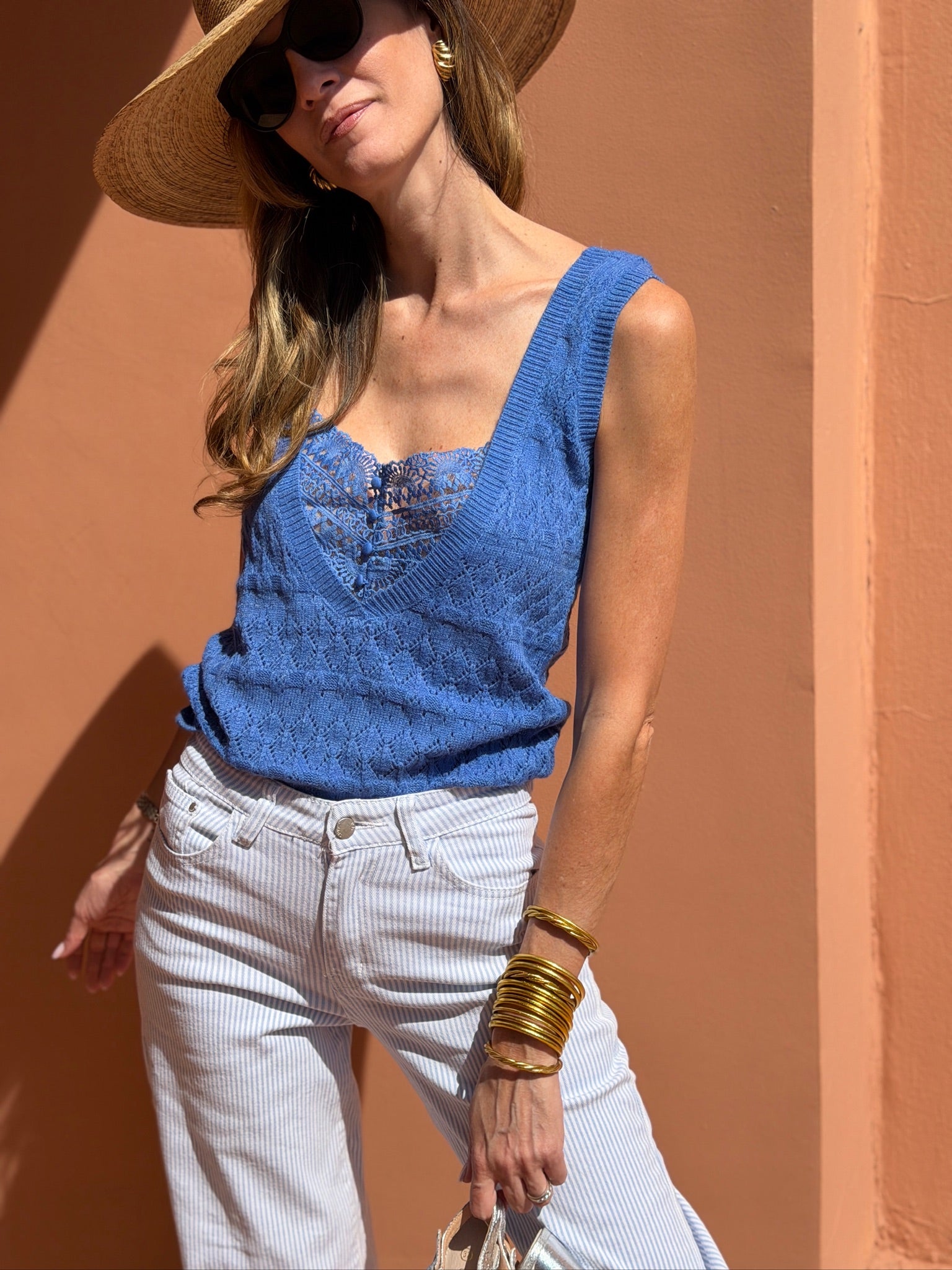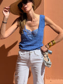 Agathe est un débardeur en maille avec un plastron de dentelle cousue, les deux pièces ne font qu'un seul et même débardeur.