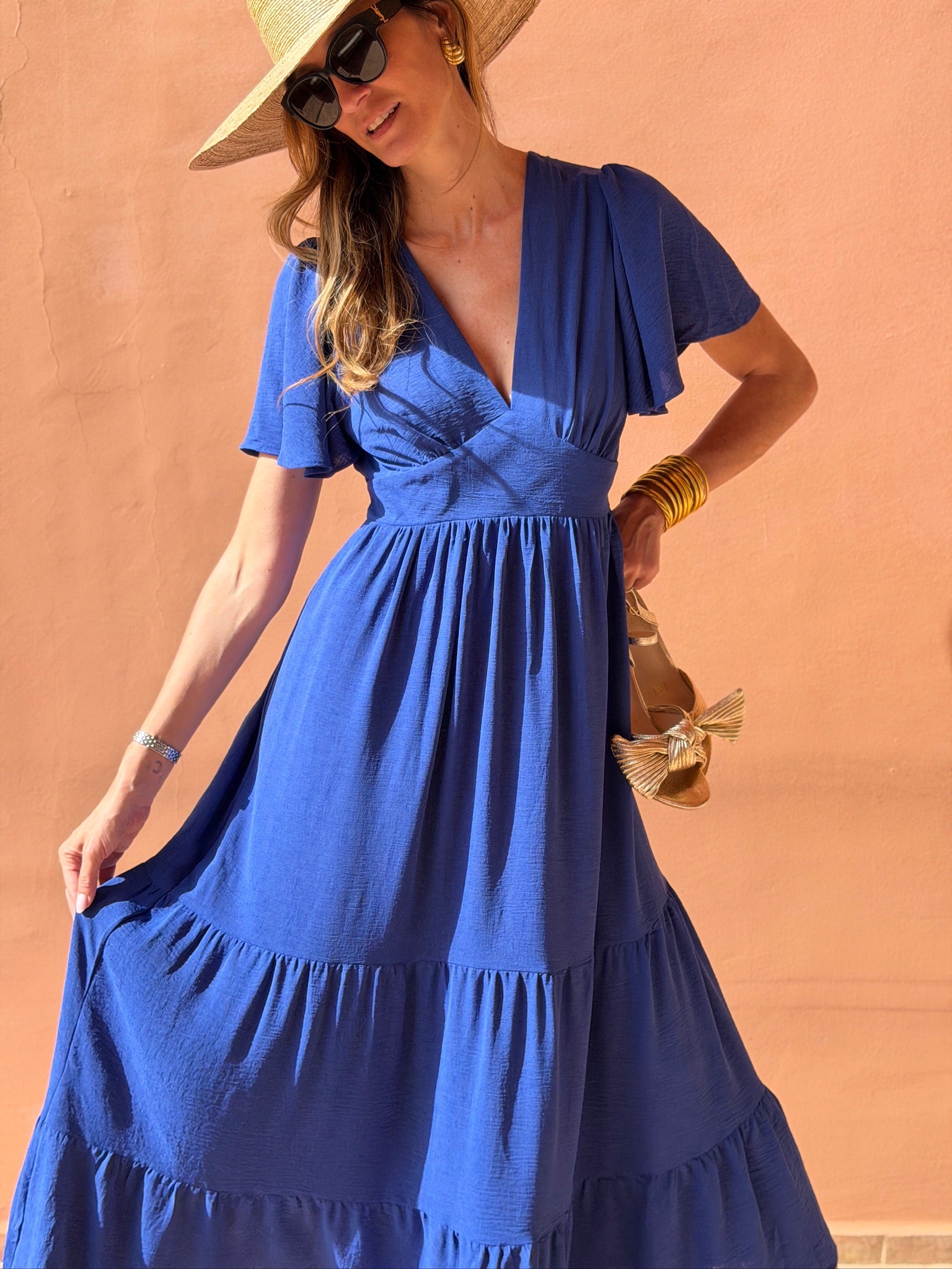 Son décolleté en V croisé met en valeur le port de tête, tandis que sa taille marquée sous poitrine élance naturellement la silhouette. Les manches courtes papillon apportent mouvement et légèreté, et sa jupe longue à volants crée un tombé vaporeux d’une grande élégance.