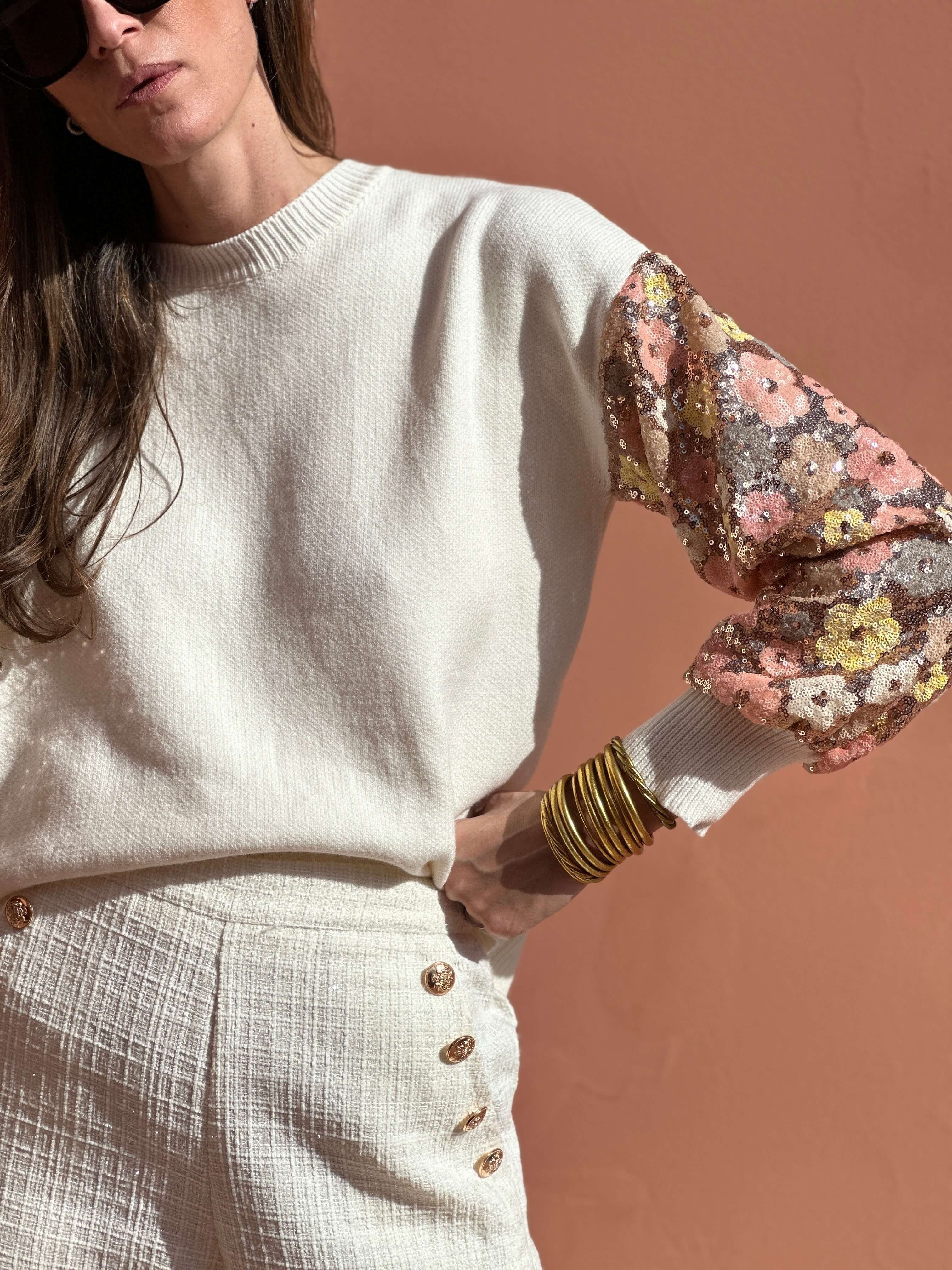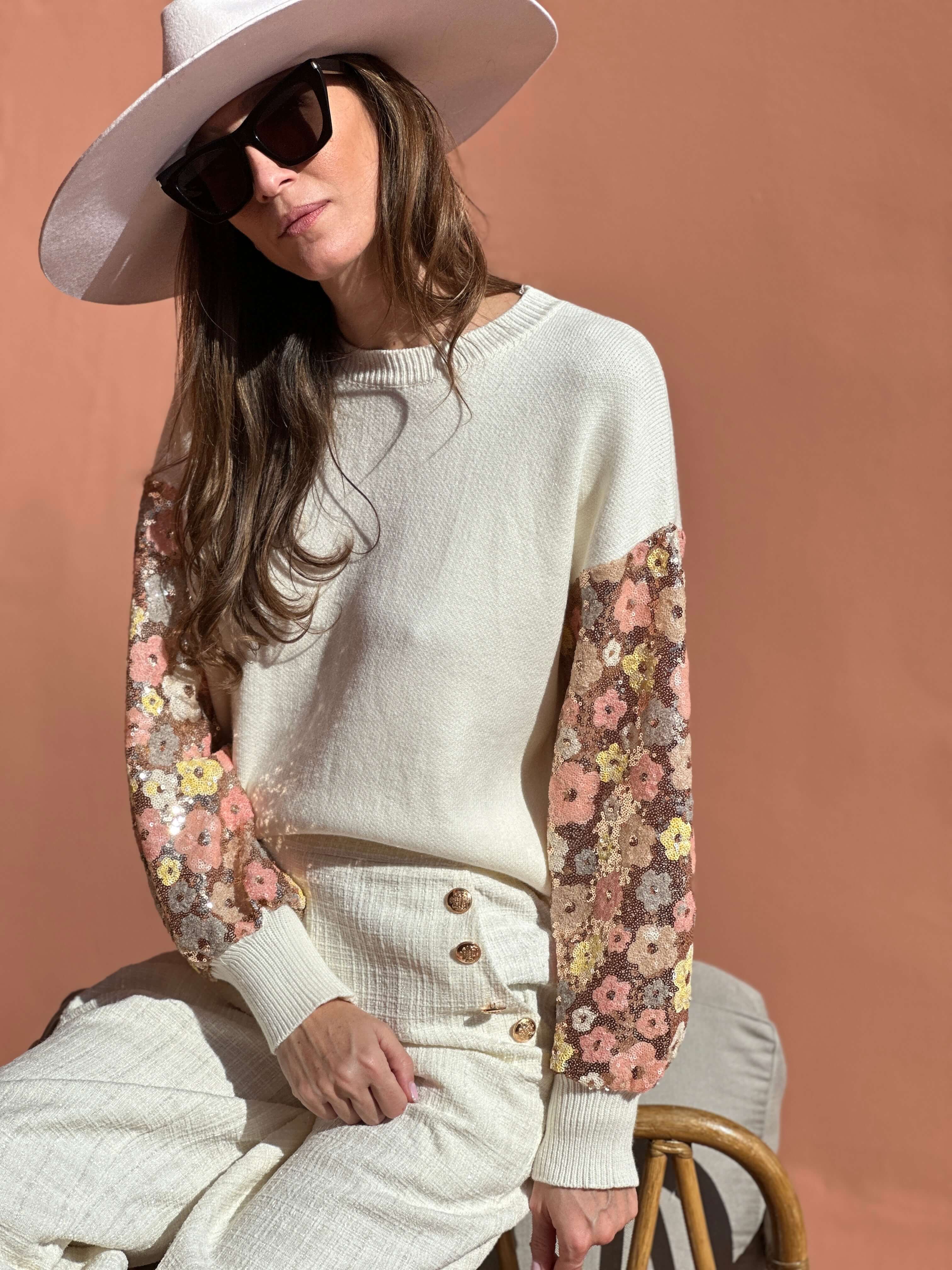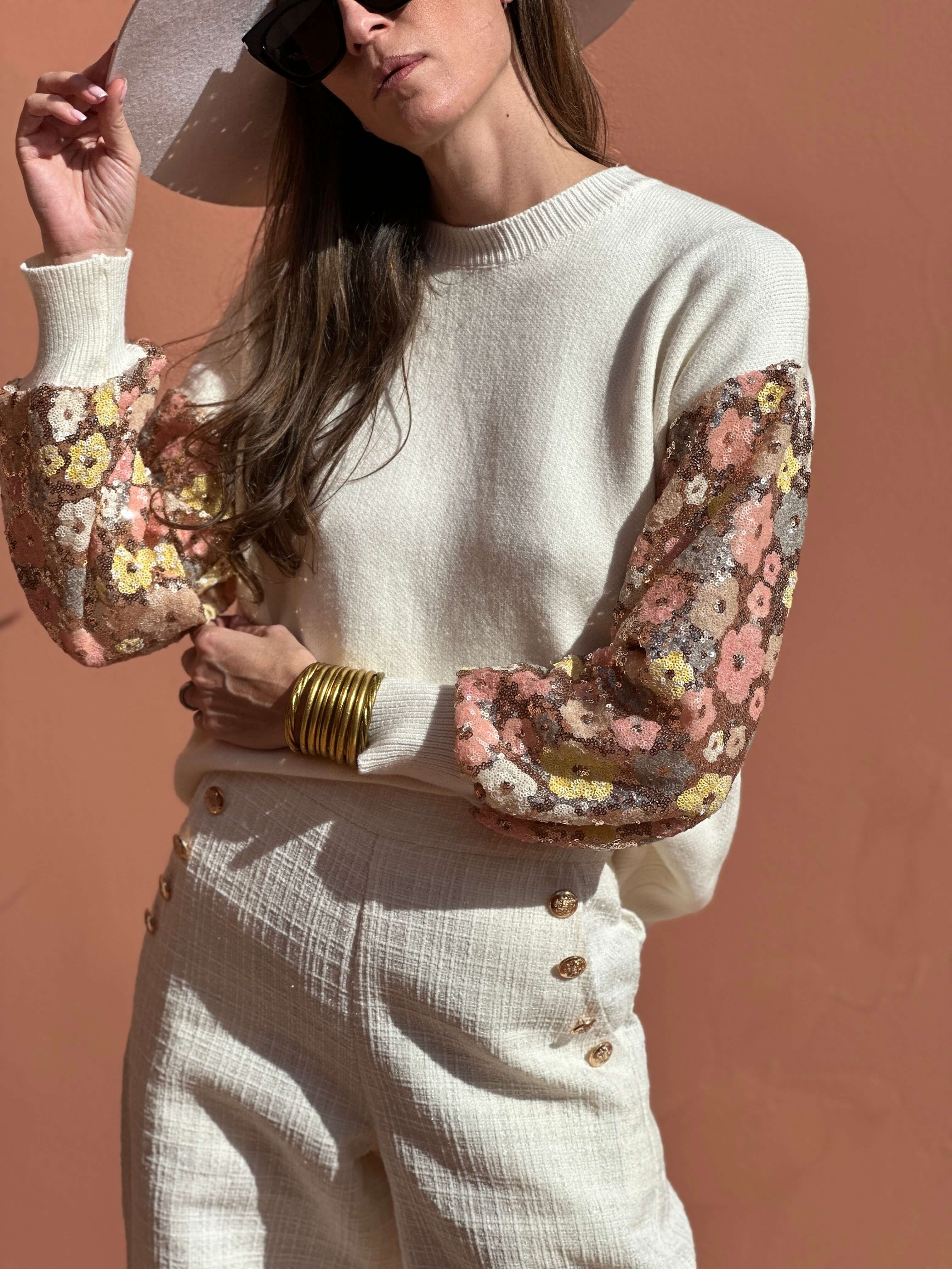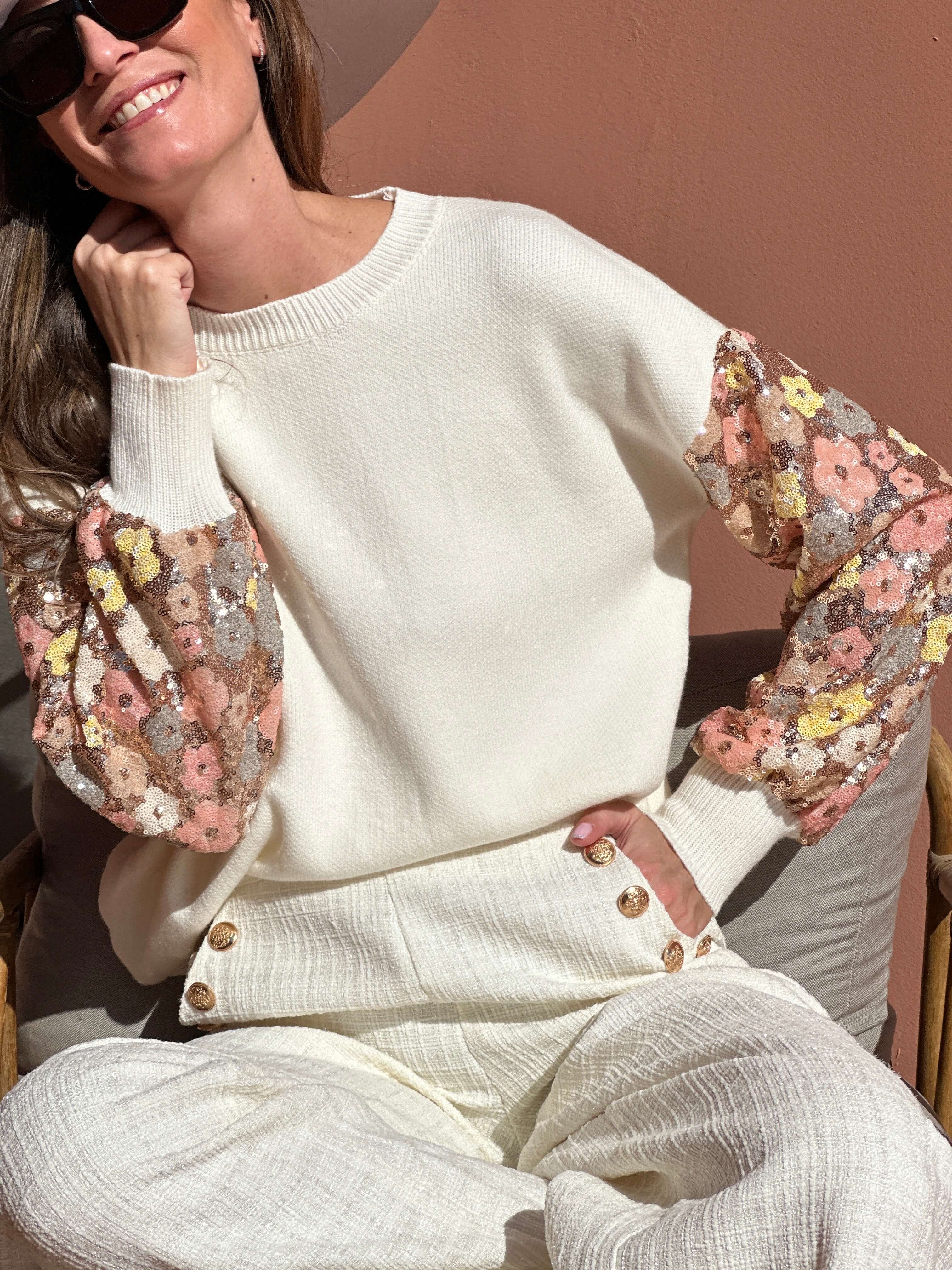 Notre maille Delora sera vous séduire par sa coupe boyfriend, toujours en finition avec ses jolies manches entièrement brodées en sequin au motif printanier.